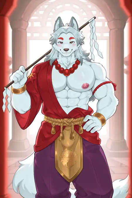 score_9, score_8_up, score_7_up, by thenewpassion, lion, felid, felis, feline, furry, furry male, muscular male, pectorals, muscular, solo, animal ears, 1boy, nipples, abs, thighs, thick thighs, loincloth, large pectorals, bara, smile, closed eyes, pelvic curtain, feet out of frame, blush, armpits, gradient background, girly, femboy, wide hips