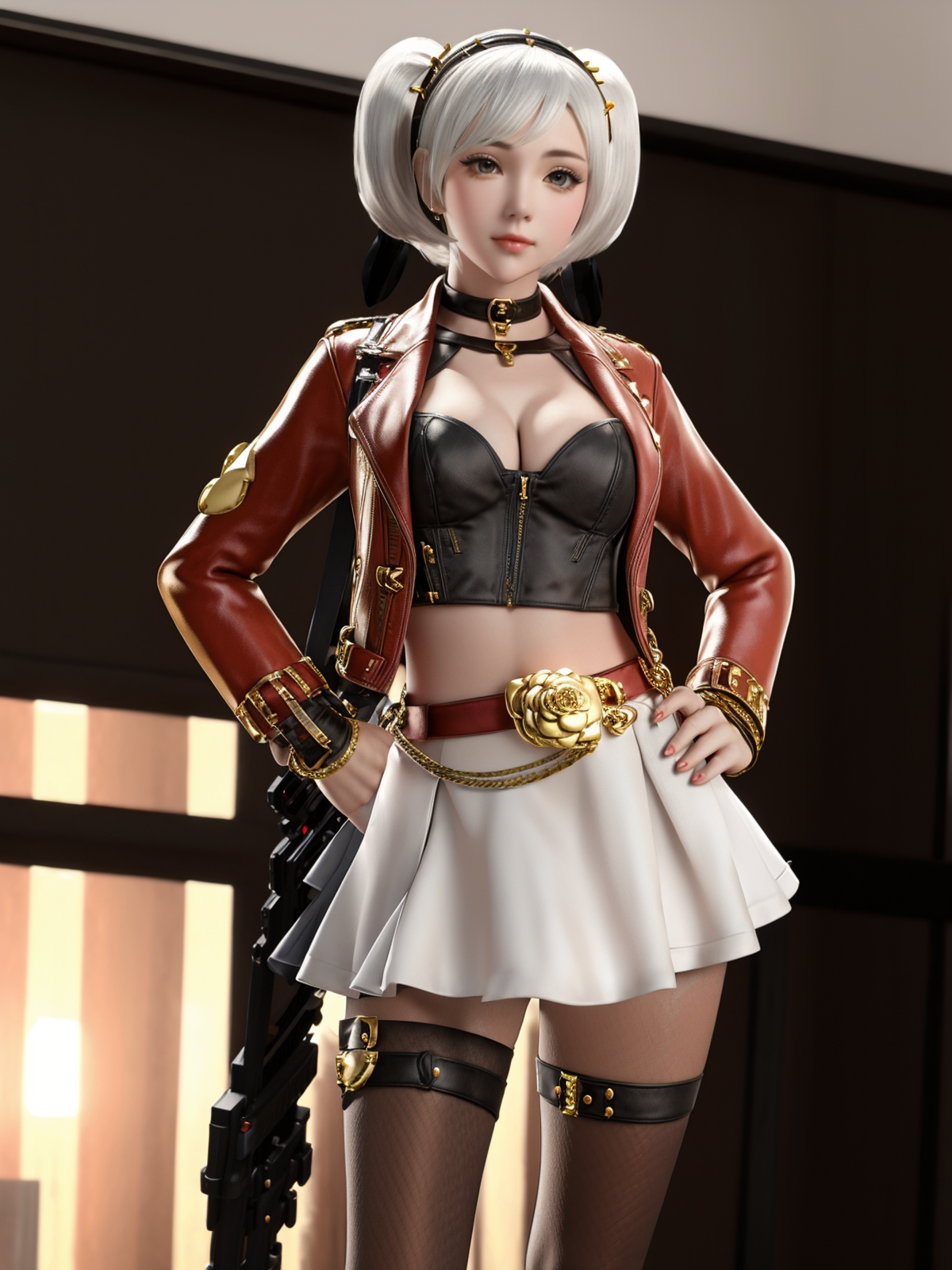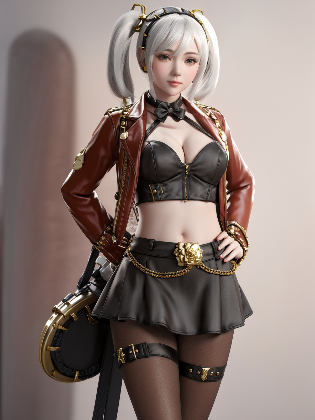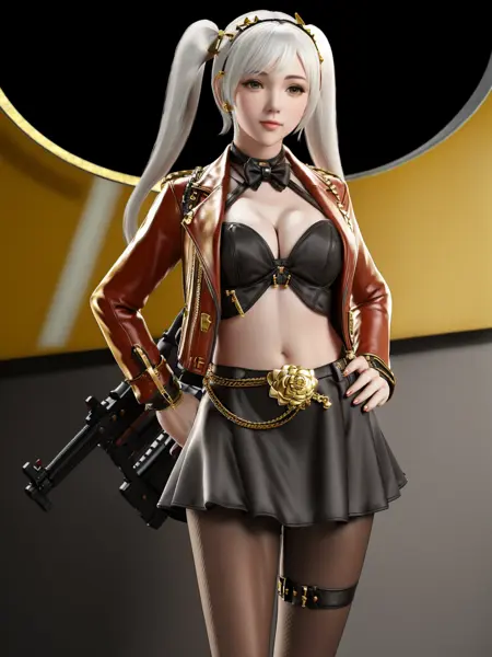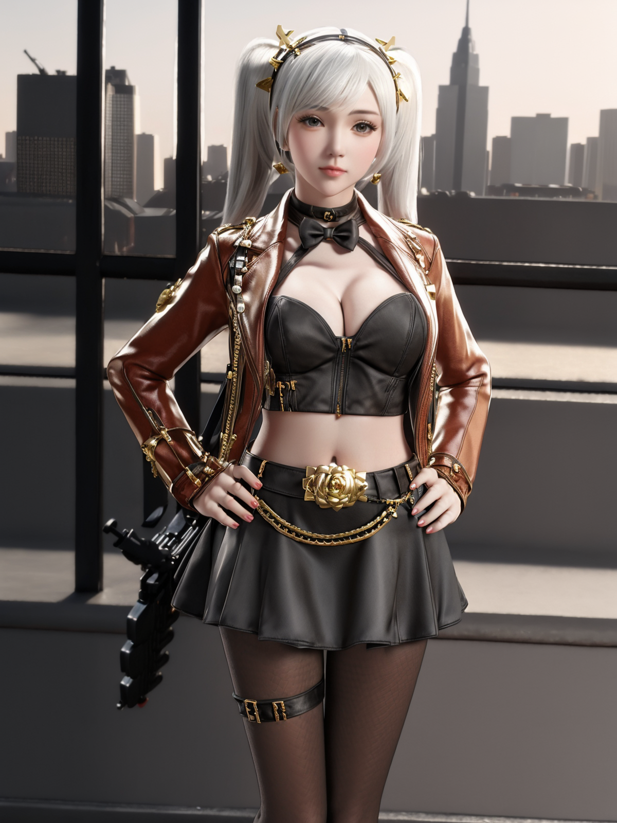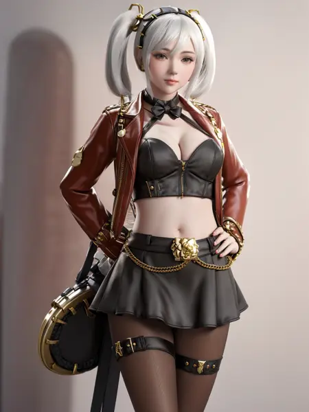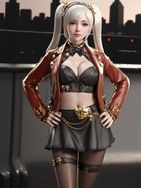 - CFshenpanzheQF, 1girl, solo, gloves, breasts, skirt, jacket, midriff, hairband, short twintails, nail polish, choker, fishnet pantyhose,cowboy shot,white hair, ,cityscape, night, looking at viewer, mature female, hand on hip,