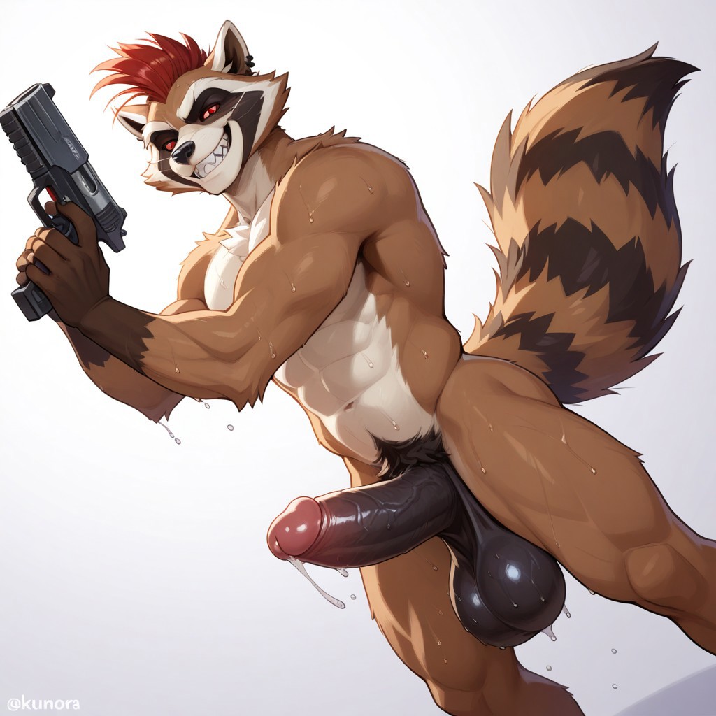 furry, anthro, raccoon, brown body, brown fur, red sclera, red eyes, black nose, fluffy tail, sharp teeth, fangs, mohawk
