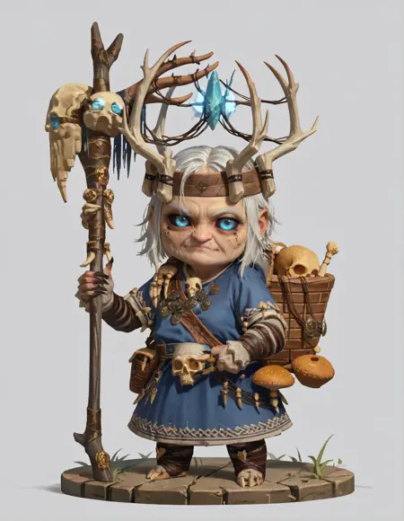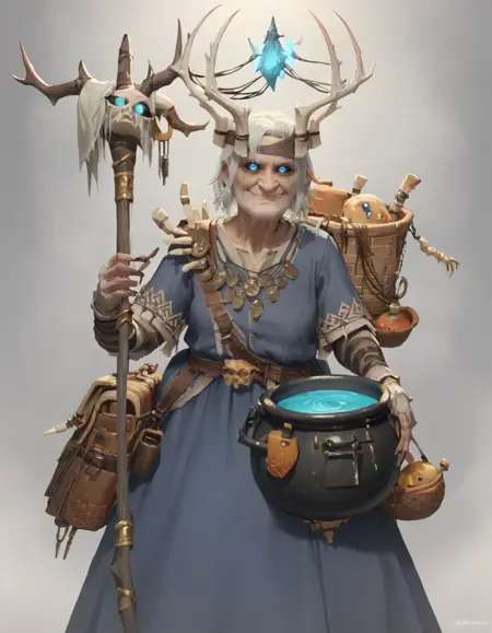 Ostankya, 老妇人, 蓝色长裙, 手套, 白发, 蓝眼, 黑色巩膜, 角, 鹿角, 饰品, 长指甲, 手持法杖, 背包篮子, 头骨,