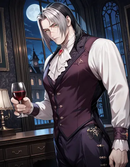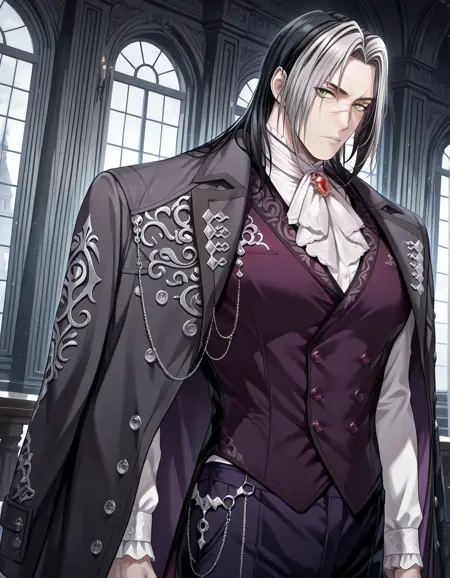 DemonPTN, 녹색 눈, 긴 머리, 갈라진 앞머리, 검은 머리, 풀어낸 머리, 회색 머리, 이색 머리, 검은 롱코트, 긴 소매, 흰색 크라바트, 빨간 브로치, 보라색 조끼, 은색 체인, 은색 단추, 어깨에 입은 코트.