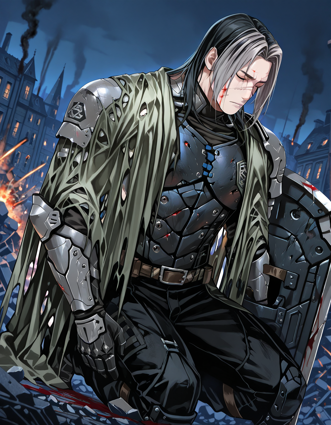 갑옷 조끼, 망토, 찢어진 망토, 검은 바지, 벨트, 어깨 갑옷, 장갑, 부츠.