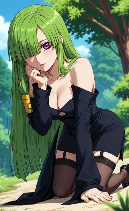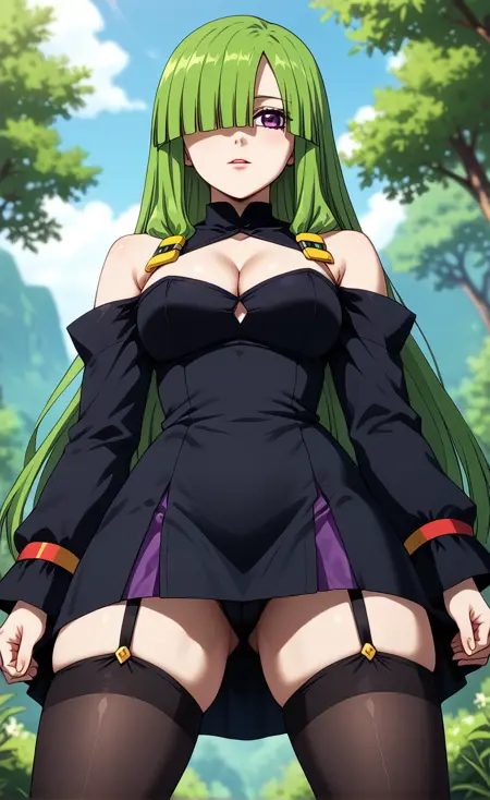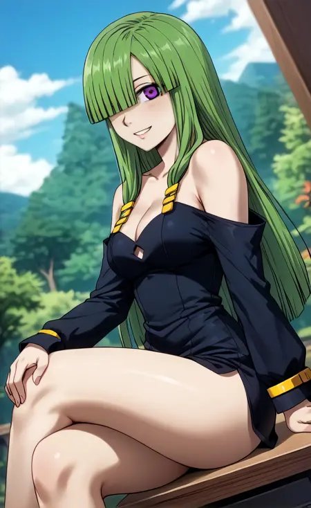 (long_hair,very_long_hair, purple_eyes, green_hair, blunt_bangs,hair_over_one_eye,