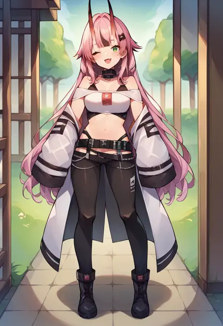 Costume 2: 1girl, IchigoInuzuka2cstm, long hair, shirt, long sleeves, hair ornament, navel, bare shoulders, very long hair, green eyes, underwear, white shirt, pink hair, boots, horns, choker, pants, belt, midriff, stomach, black footwear, off shoulder, crop top, black pants, black belt, lock of black hair,