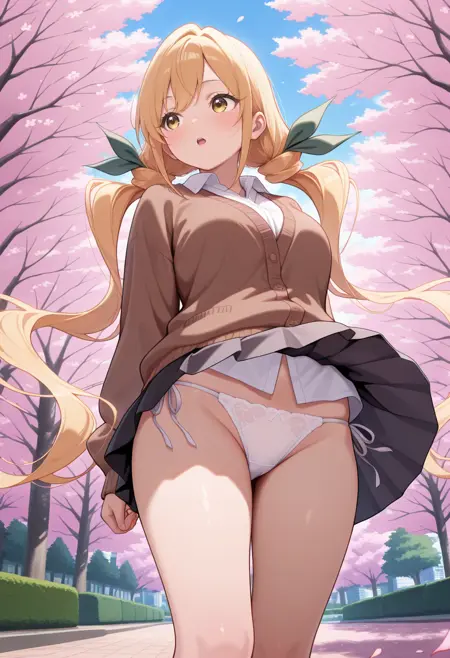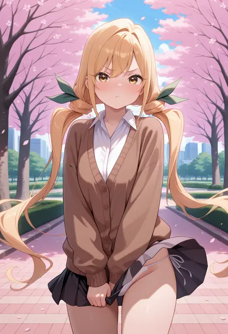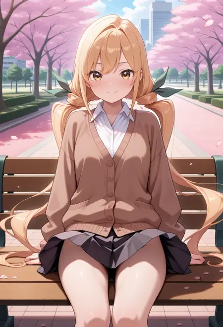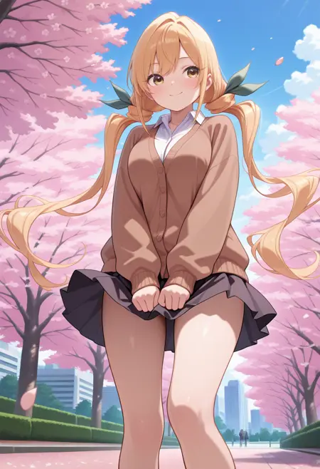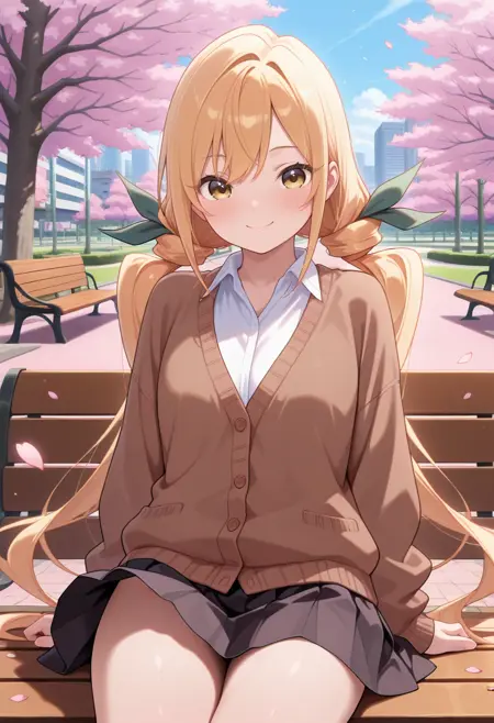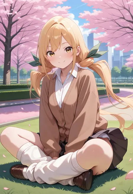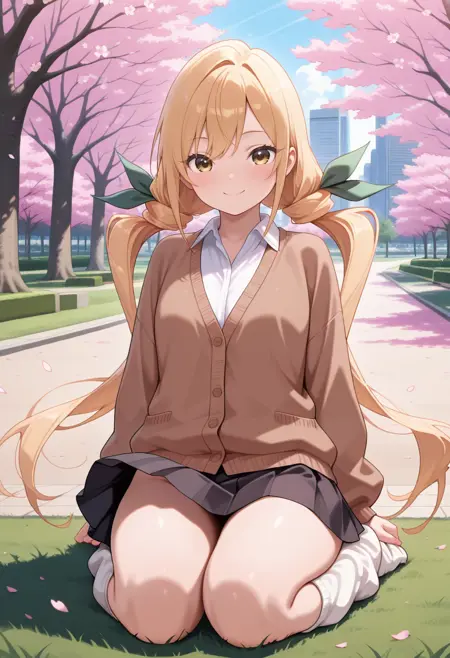 karaneinda, 1girl, long hair, yellow eyes, hair ribbon, ribbon, low twintails, shirt, collared shirt, school uniform, cardigan, green ribbon, blonde hair, pleated skirt, very long hair, miniskirt, black skirt, smile, white legwear, loose socks.