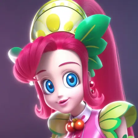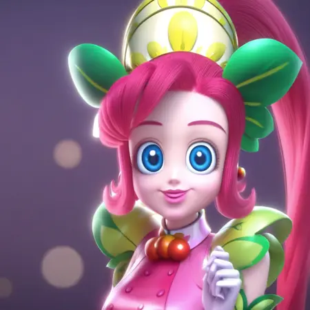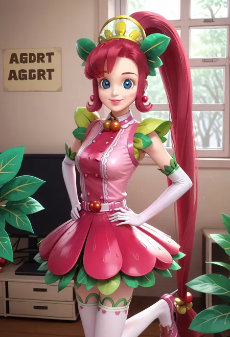 トリガーワード: 1girl, Solo, SugarPang_HI, ベージュ肌, 青い目, ラズベリー色の髪, ラズベリー色の眉毛, ピンクの唇, 非常に長い髪, 高くカーブしたポニーテール, 赤いメタリックなイヤリング, 葉付きレモンのティアラ, 白いカラー, メタリックなオレンジ色の球体のネックレス, 草莓のモチーフ付き白いベルト, ピンクとホットピンクのボタン付きストライプトップ, 袖には果物の葉の模様, 長い白い手袋, ピンクの花びらスカート, 長い白いパンティーストッキング, 葉付き濃いピンクのハイヒール