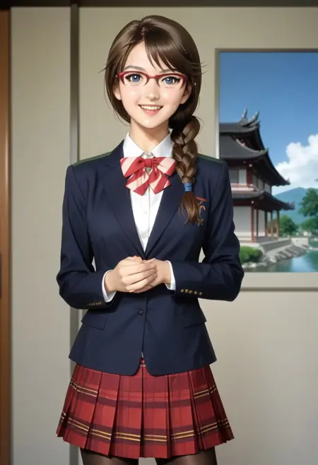 옷장 태그: "팬티홀스, 안경, 치마, 땋은 머리, 갈색 머리, 파란 눈, 어깨에 걸친 머리, 학교 유니폼, 단일 땋은 머리, 신발, 재킷, 블레이저, 긴 머리, 주름치마, 로퍼, 체크무늬, 체크무늬 치마"