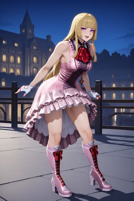 lilit8, long hair, hime cut, blonde hair, blunt bangs, purple eyes, makeup, eyeshadow, lips, sleeveless, red neckerchief, pink dress, necklace, high-low skirt, white gloves, fingerless gloves, pink footwear, knee boots, high heel boots