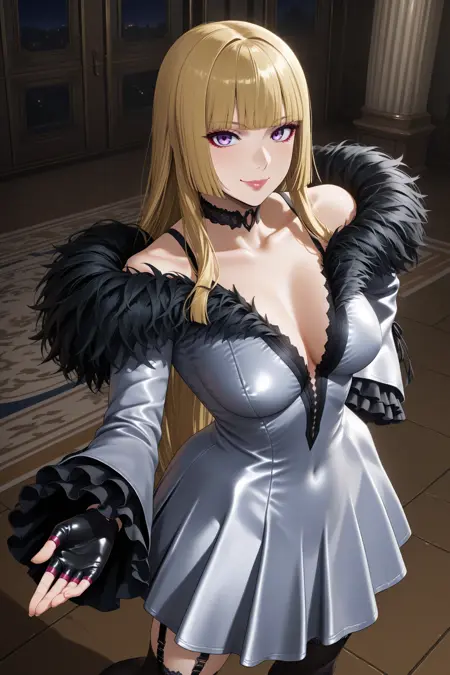 lilit8bcm, long hair, hime cut, blonde hair, blunt bangs, purple eyes, makeup, eyeshadow, lips, long sleeves, frilled sleeves, choker, grey dress, fur-trimmed dress, black gloves, fingerless gloves, garter straps, grey footwear, strappy heels