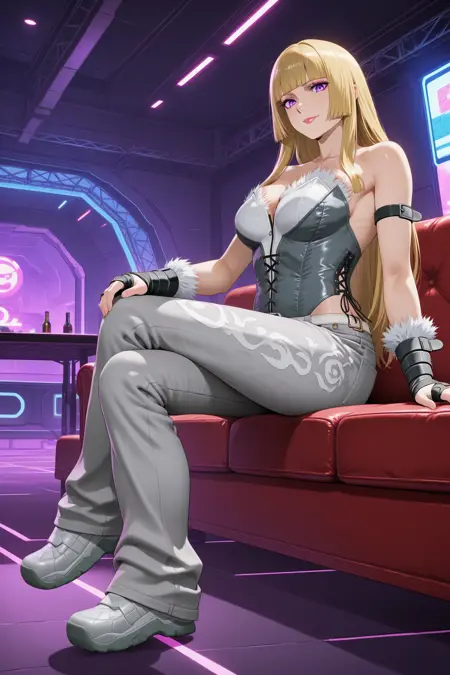 lilit5p1, long hair, hime cut, blonde hair, blunt bangs, purple eyes, makeup, eyeshadow, lips, bustier, strapless, sleeveless, fur trim, arm belt, black gloves, belt, grey pants, grey footwear, sneakers