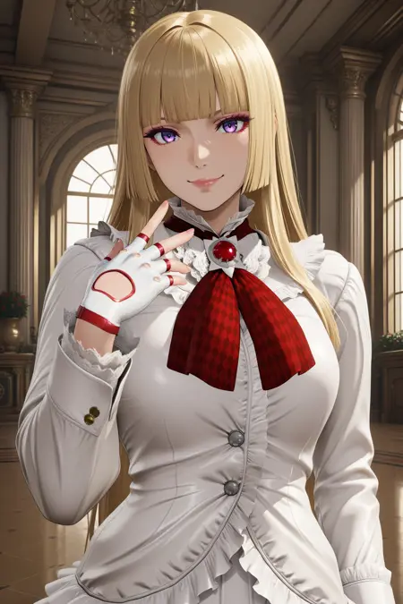 lilit5p2, long hair, hime cut, blonde hair, blunt bangs, purple eyes, makeup, eyeshadow, lips, white jacket, white skirt, frills, frilled jacket, frilled skirt, white gloves, fingerless gloves, brooch, red neckerchief, white footwear, knee boots, high heel boots