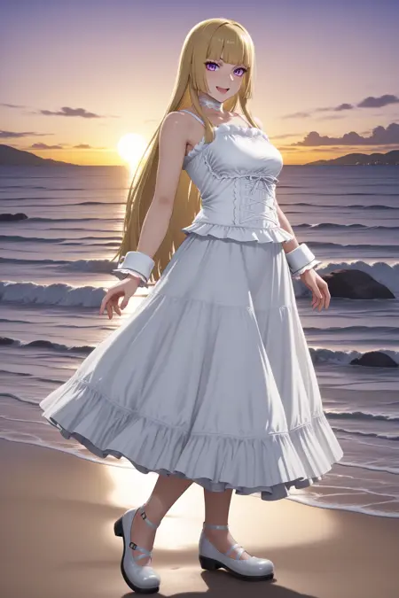 lilittt2, long hair, hime cut, blonde hair, blunt bangs, purple eyes, makeup, eyeshadow, lips, sleeveless, white camisole, white choker, white wrist cuffs, white skirt, long skirt, white footwear, flats