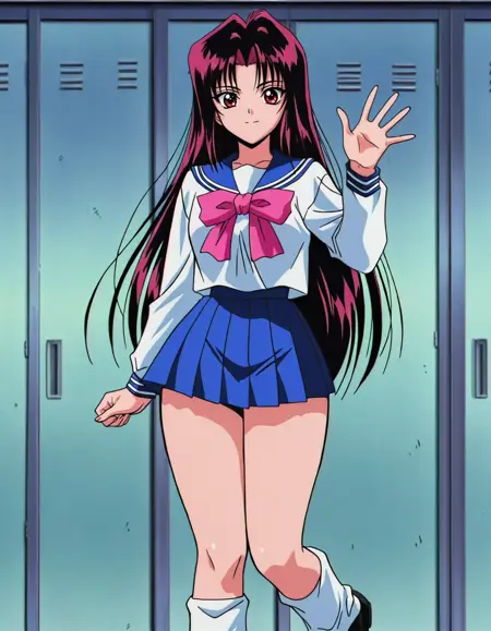 (v1.1) 1girl, haduki izuna, solo, ova style, general, gyaru, kogal, long hair, black hair, red eyes, serafuku, blue sailor collar, pink bowtie, blue skirt, miniskirt, loose socks, black loafers, medium breasts, thick thighs, standing, outdoors, anime coloring, anime screencap, retro artstyle, 1990s \(style\)