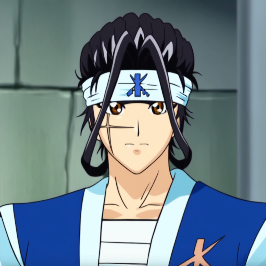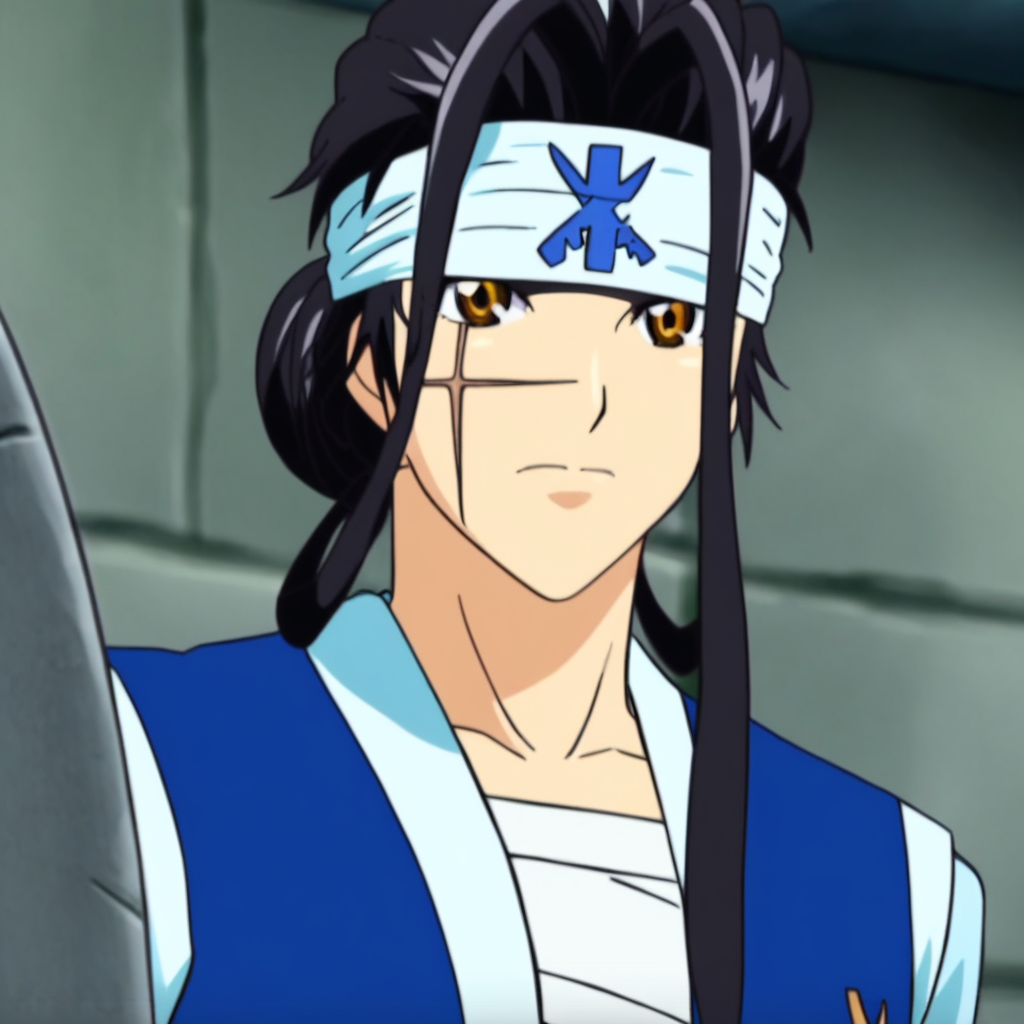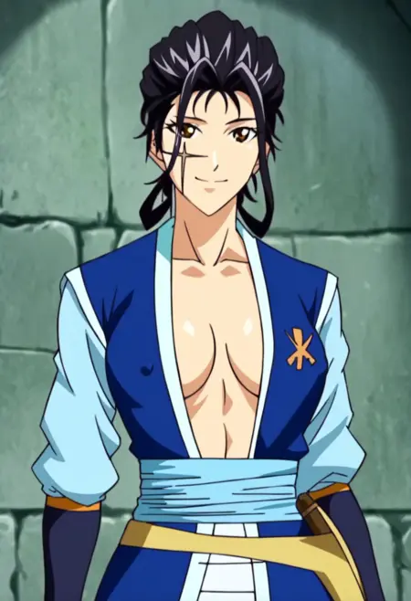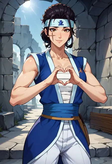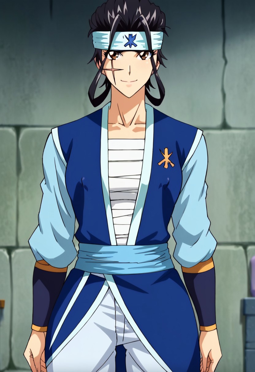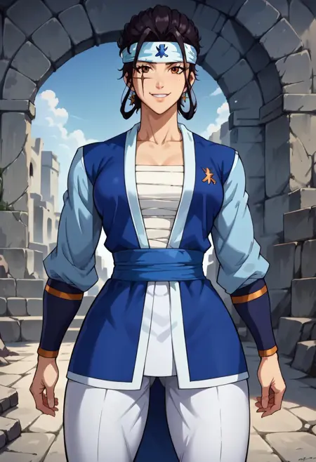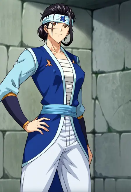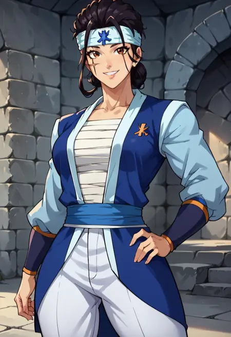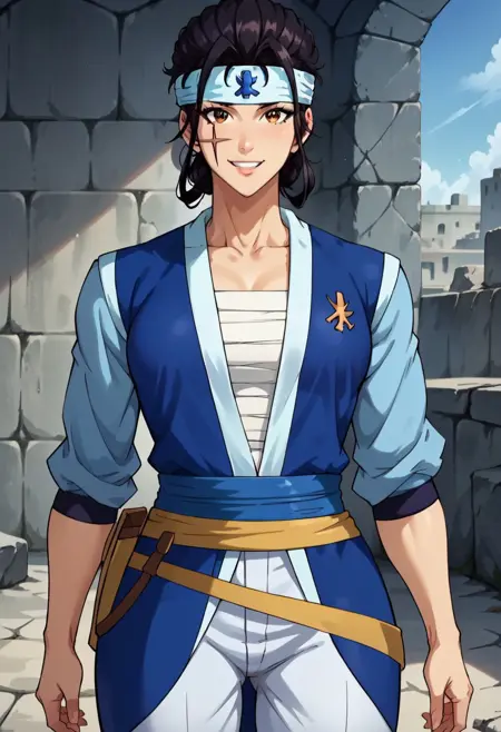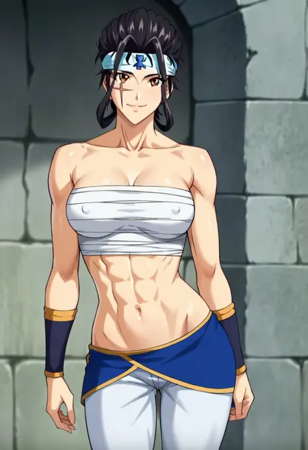 MelkTRK, 1个女孩, 单人, 皮肤白皙的女孩, 肌肉线条, 美丽的女孩, 黑发, 发饰, 发髻, 头带, 棕色眼睛, 脸上有疤痕, 腹部缠布, 夹克, 白色长裤, 腰带, 皮带, 黑色靴子, 十字形疤痕,