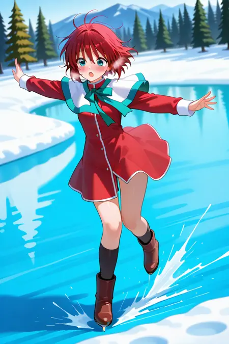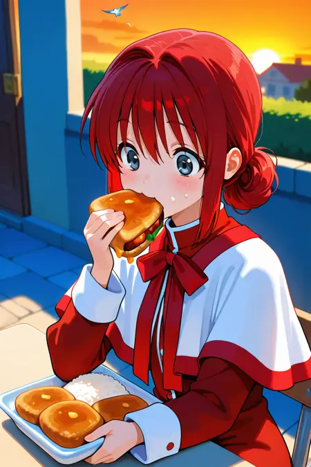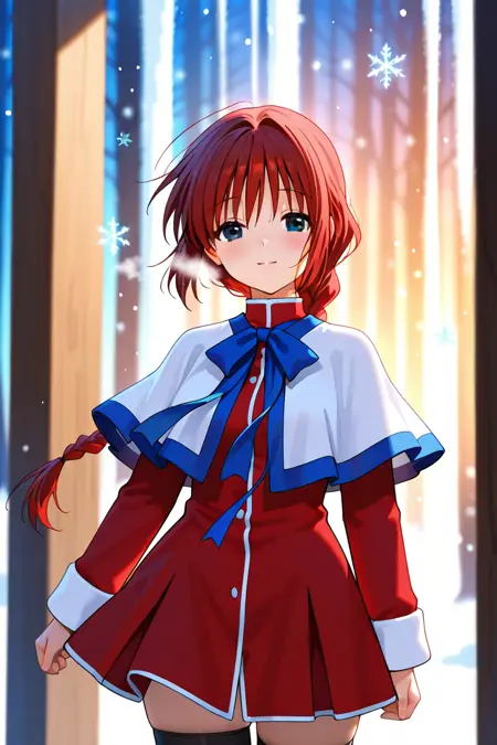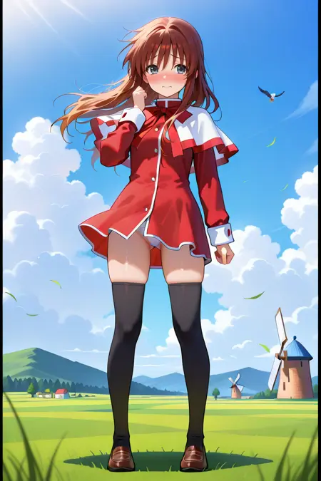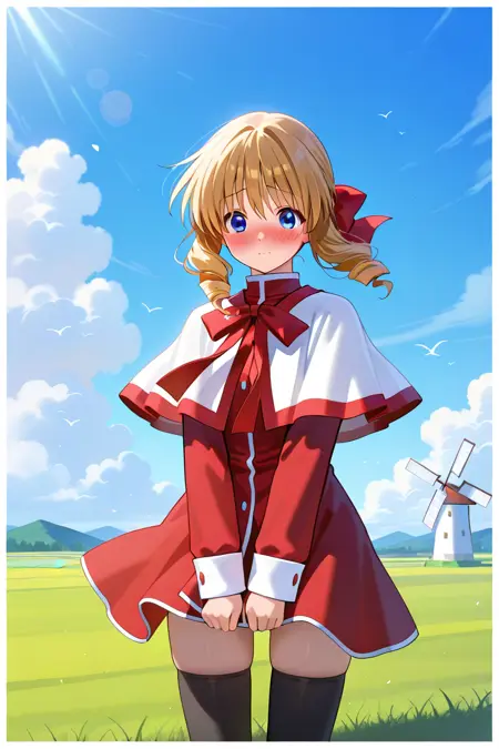 school uniform,skirt,red skirt,long sleeves,capelet,red dress,white capelet,dress,bow,short dress