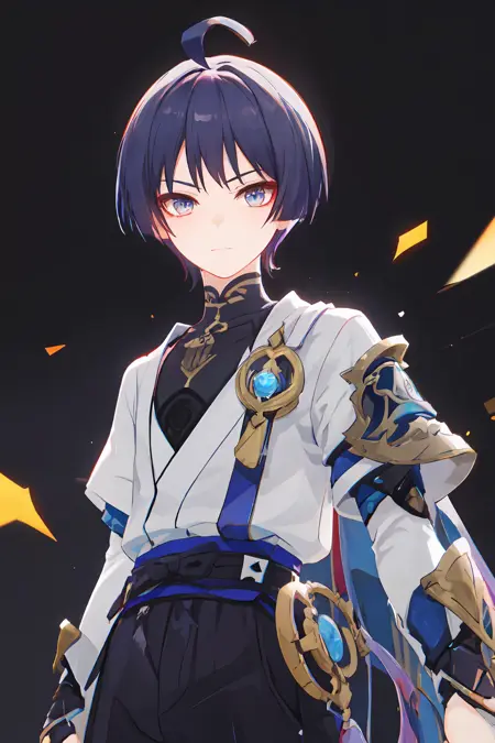 杰作,最佳质量,1个男孩,三兵,单人,侧发,男性焦点,上半身,呆毛, blunt ends,看向观众,简单背景,牛仔构图,