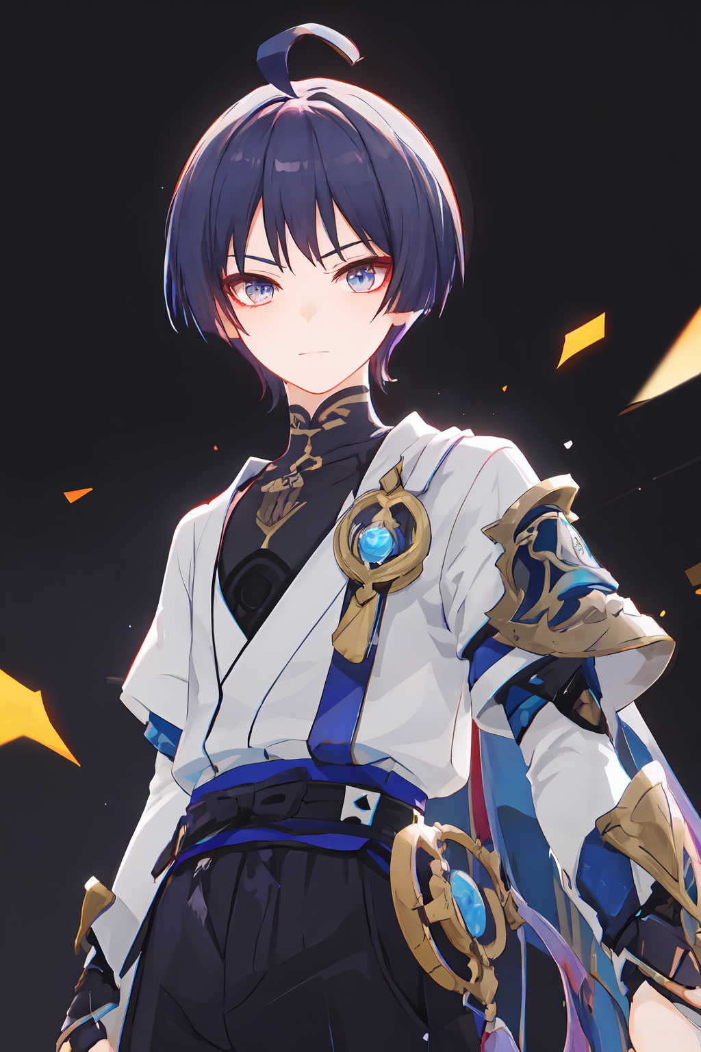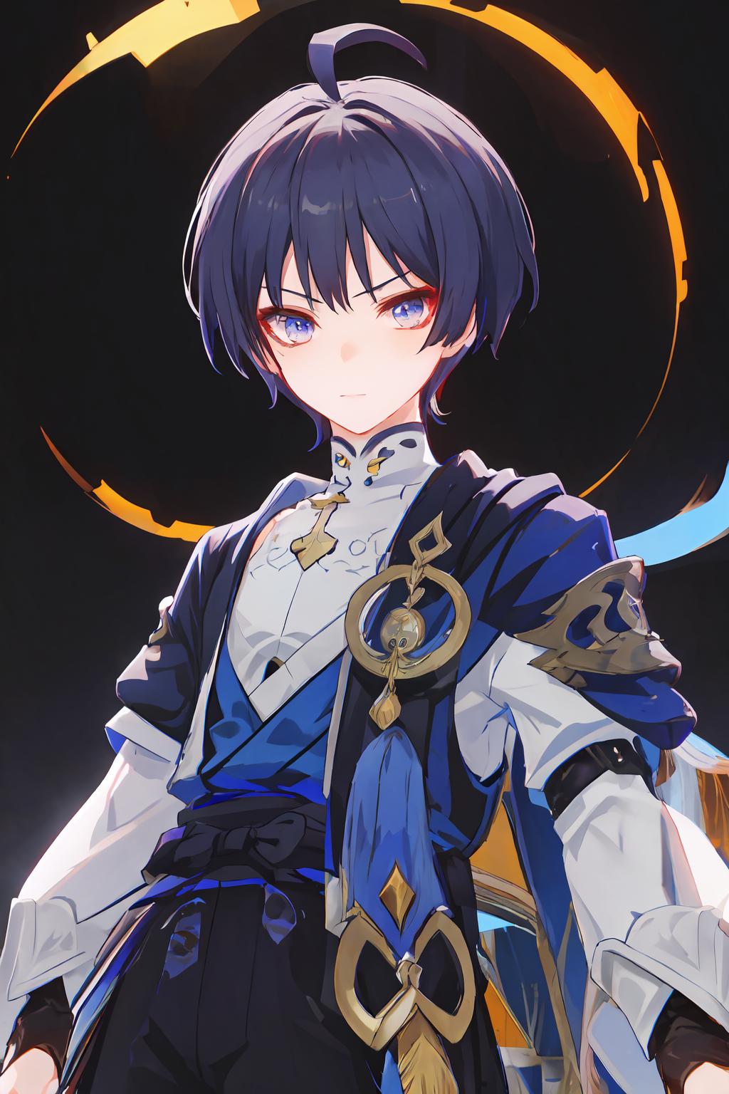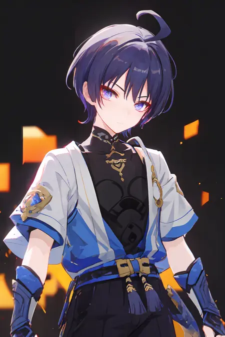マスタピース、最高品質、1人の少年、三兵、シングル、サイドロックス、男性焦点、上半身、アホ毛、ブランプエンド、観察者を見つめる、シンプルな背景、カウボーイショット、
