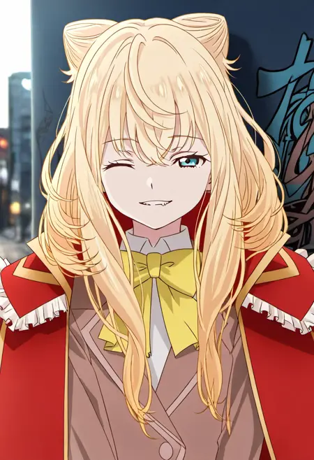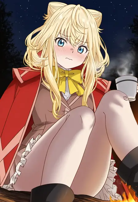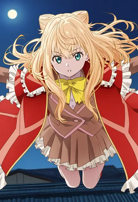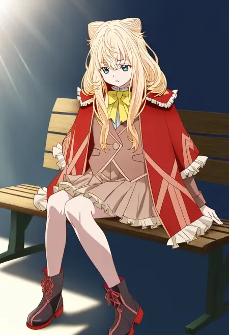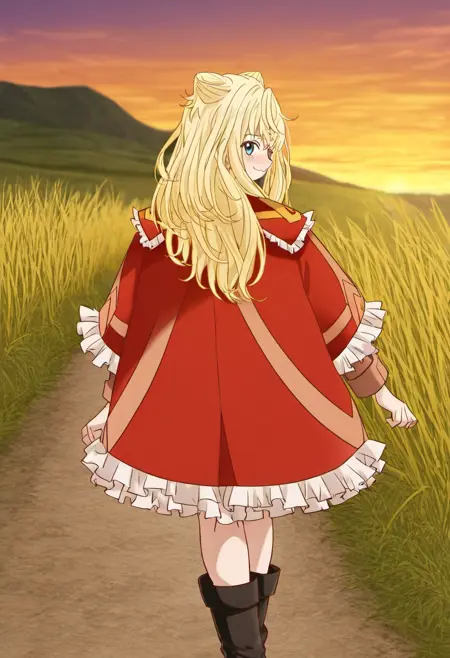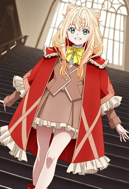 복장 프롬프트 A: 빨간 망토, 갈색 자켓, 노란 리본, 갈색 치마, 프릴, 부츠, 빨간 악센트