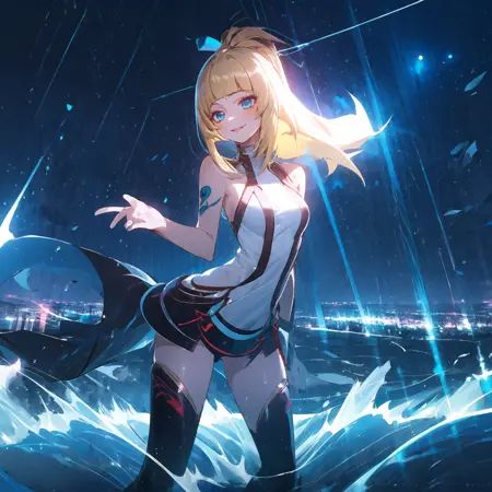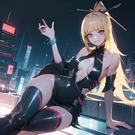 Example Prompt: 1girl,blue eyes,bare shoulders, blonde hair,blunt bangs,cleavage, collarbone, detached sleeves, dress,tattoo, long hair, thigh boots,jewelry, medium breasts,(hair stick:1.2), hair ornament, high ponytail
