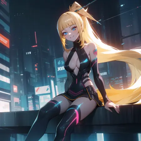예시 프롬프트: 1girl,blue eyes,bare shoulders, blonde hair,blunt bangs,cleavage, collarbone, detached sleeves, dress,tattoo, long hair, thigh boots,jewelry, medium breasts,(hair stick:1.2), hair ornament, high ponytail