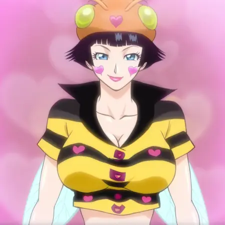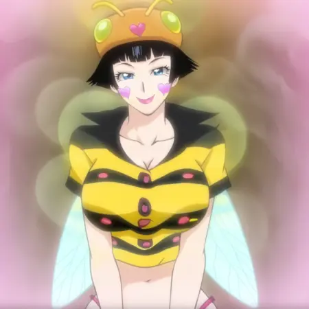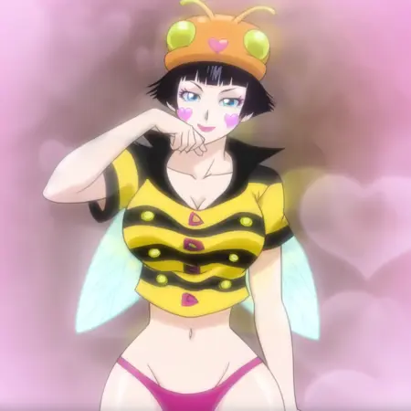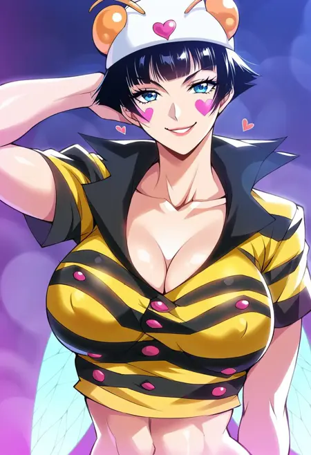 WardenLoveTRK, 1个女孩, 单人, 高挑女性, 有吸引力的女性, 丰满的女性, 白皙皮肤女性, 黑发, 短发, 蓝眼睛, 双颊各有一个心形纹身, 穿着暴露的服装, 上衣, 丁字裤, 高跟鞋, 昆虫翅膀, 上衣印有“LOVE”字样, 帽子, 条纹图案上衣, 大胸, 深邃乳沟, 肚脐, 小腹, 腹股沟, 短袖, 按扣, 锁骨, 妆容, 触角,