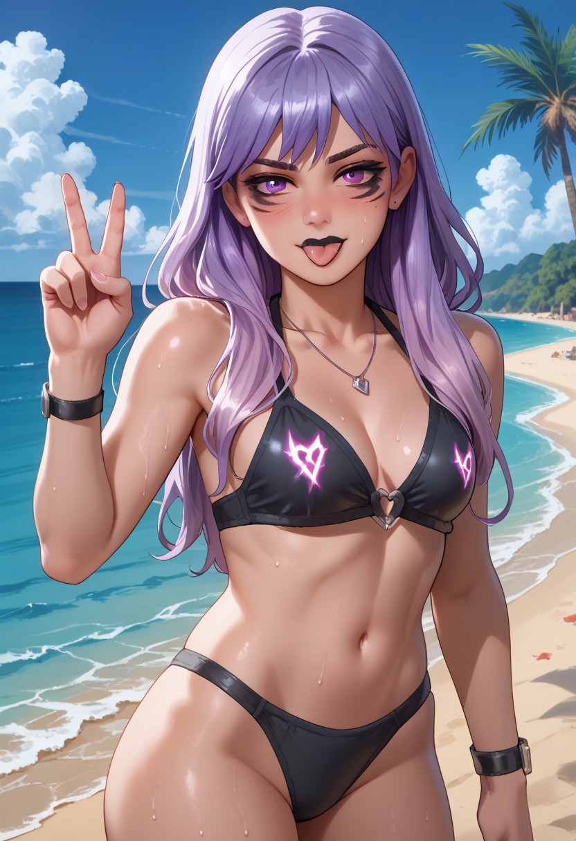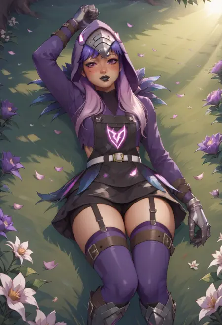 RavenTeamSyd, 1소녀, 보라색 눈, 보라색 머리카락, 긴 머리카락, 검은 입술, 보라색 후ood, 보라색 털, 청바지 점프수트-스커트, 흰색 벨트, 스트랩, 보라색 허벅지 양말, 등에 보라색 깃털, 금속 부츠, 금속 장갑