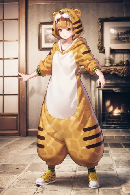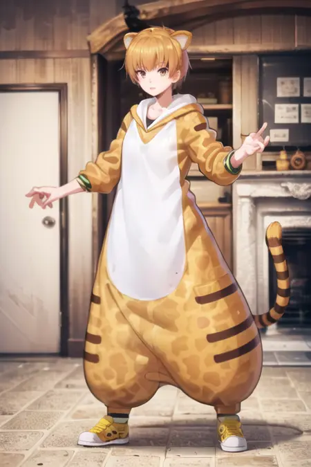 a anime character standing on it's hind legs dressed as a tiger, solo, 1girl, animal costume, tiger print, full body, animal print, brown eyes, standing, room background, looking at viewer,