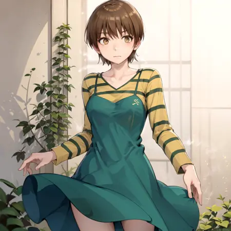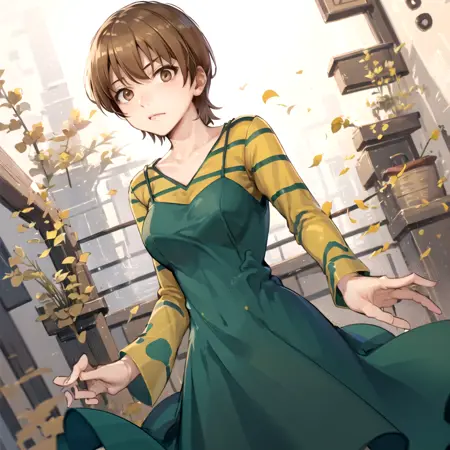 a anime woman in a green dress, 1girl, solo, brown hair, brown eyes, short hair, dress,