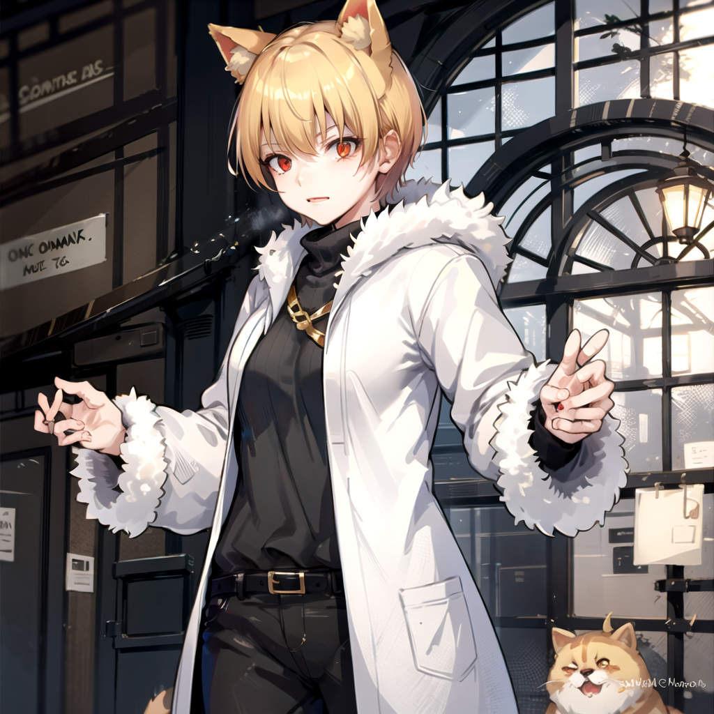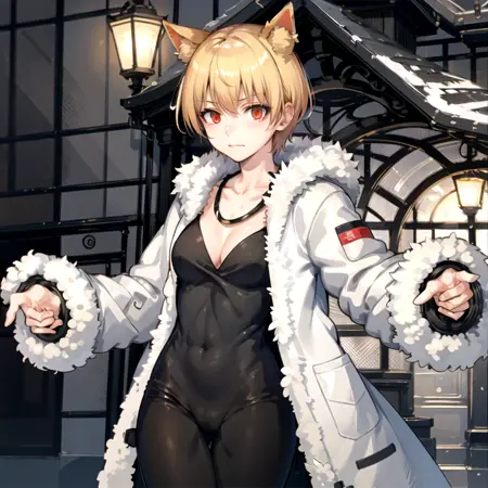 a person in a black white coat with black fur, 1girl, solo, animal ears, red eyes, fur coat, blonde hair, short hair,