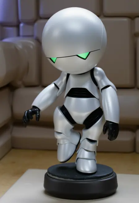 - (SUBJECT)의 세련되고 만화풍의 인형을 촬영한 사진으로, 역동적인 액션 자세로 서 있으며, 작은 둥근 (COLOR) 플랫폼 또는 기반 위에 놓여 있다. (LOCATION/COLOR) 배경.