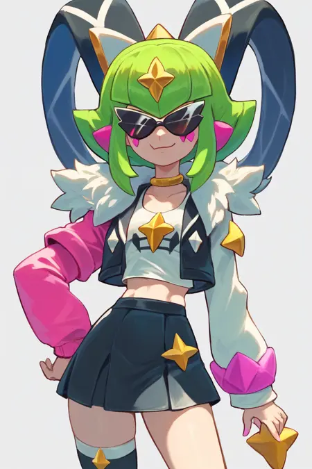 pmelodie ,1 girl , green hair ,cropped jacket , tank top ,white jaclet , pink sleeve, asymmetrical sleeves, black skirt , hair bow ,asymmetrical_legwear , sunglasses