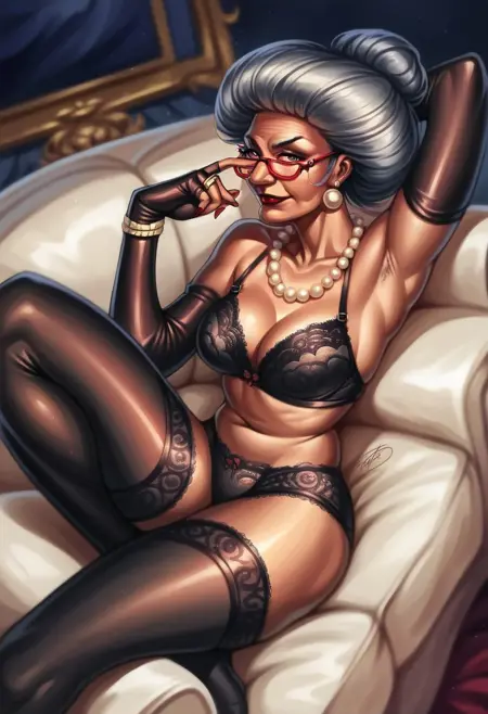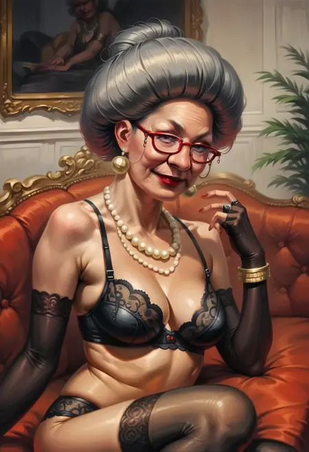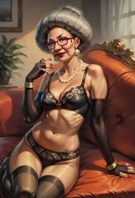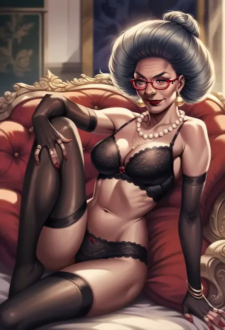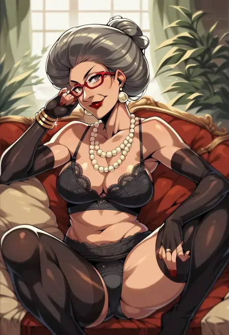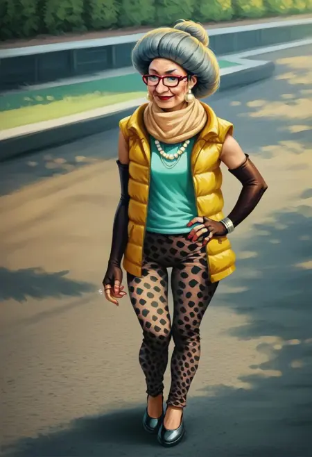 Tags are: "Matsuko_RG, old woman, grey hair, single hair bun, red-framed eyewear, earrings, red lipstick. nail polish", and her outfit is "scarf, fingerless elbow gloves, gold necklace, pearl necklace, bracelet, rings, yellow sleeveless jacket, aqua shirt, leopard print pants, black footwear".
