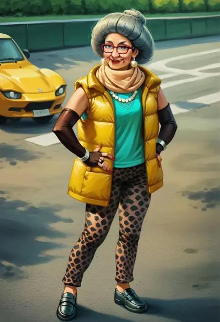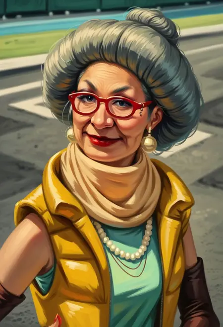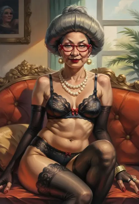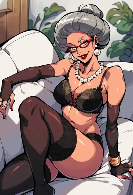 태그: "Matsuko_RG, 노인, 회색 머리카락, 단일 머리 땋기, 빨간 테안 안경, 귀걸이, 빨간 립스틱, 네일 폴리시",