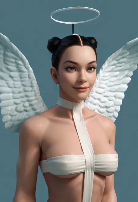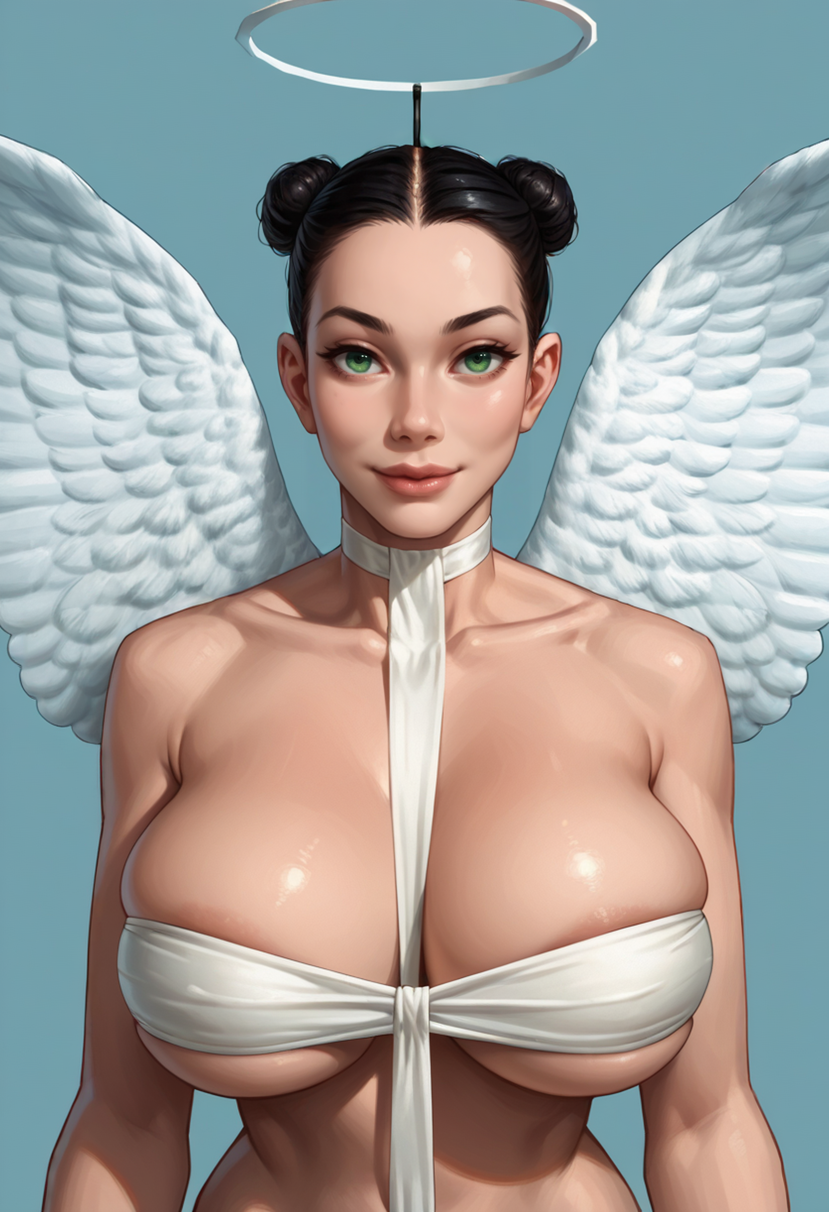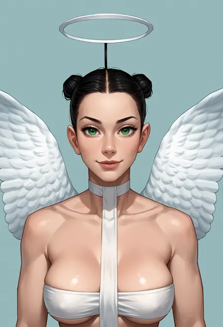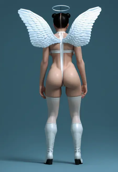1girl, 绿色眼睛, 发髻, 黑发, 翅膀, 天使翅膀, 光环, 胸部, 过膝袜, 内衣, 靴子