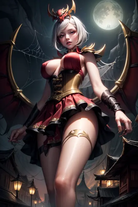 Blood Moon Elise: blood moon elise, 1girl, spider girl, short dress, corset, mask on head, short hair, white hair
