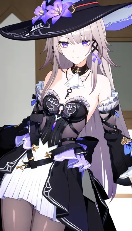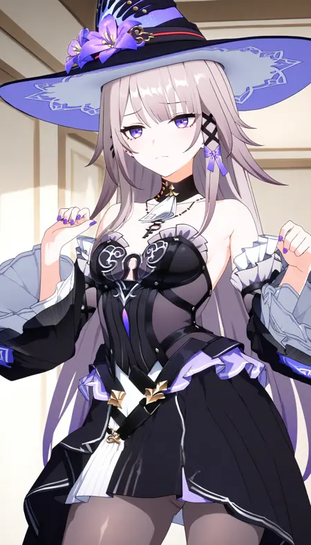 (best quality,8K, masterpiece:1.3),anime,The Herta, 1girl, young,solo,hat,purple eyes,closed mouth,long hair, detached sleeves, earrings,clevage,medium breasts,standing, key necklace,sexy,pantyhose,leg ring,nail polish,clevage,breasts,closed mouth