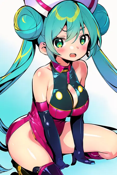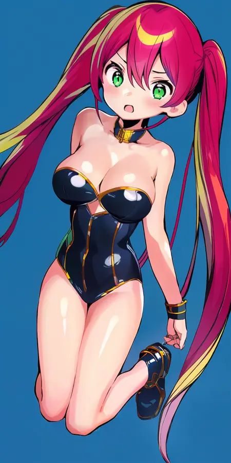 color_girl, 1girl, solo, long hair, breasts, looking at viewer, blush, open mouth, large breasts, full body, bare shoulders, twintails, very long hair, green eyes, red hair, lyco:color\_girl:1.2
