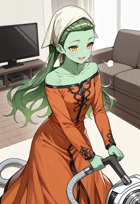 默认外观: slkSMT,绿发,长发,头巾,头发向后扎,绿皮肤,黄眼睛,橙色连衣裙,露肩连衣裙,锁骨,长袖