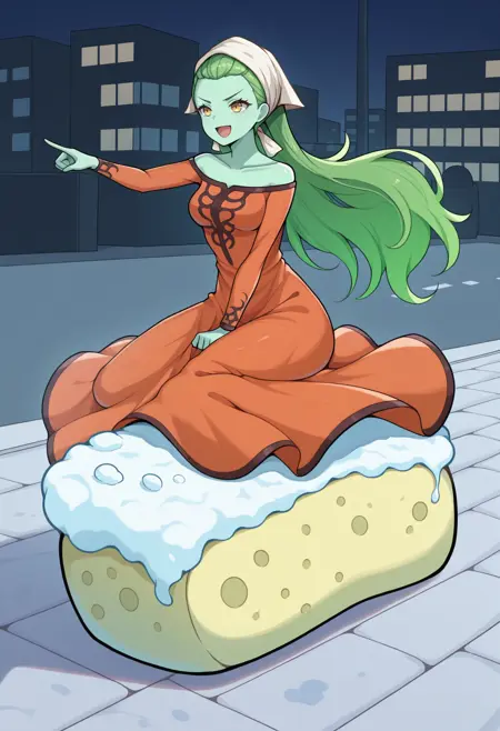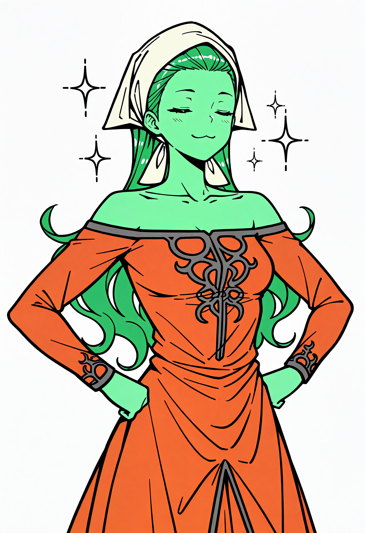 • 默认外观: slkSMT,绿发,长发,头巾,头发向后扎,绿皮肤,黄眼睛,橙色连衣裙,露肩连衣裙,锁骨,长袖
