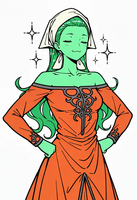 デフォルトの外見: slkSMT、緑の髪、長い髪、頭巾、髪を後ろにまとめてる、緑の肌、黄色い目、オレンジのドレス、片肩出しドレス、鎖骨、長袖