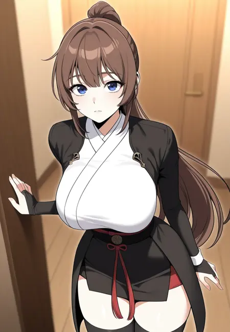 japanese clothes, black skirt, black jacket, obi, red ribbon, black thighhighs, white kimono, gloves,