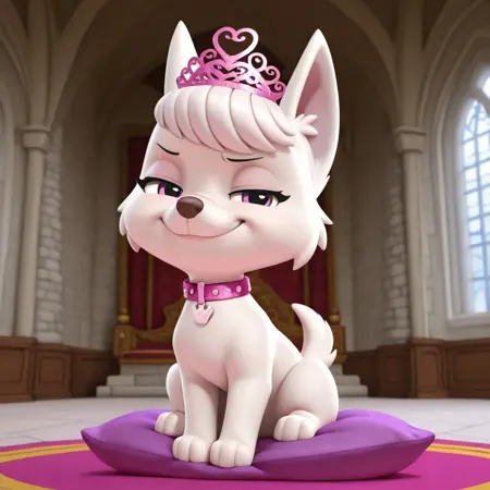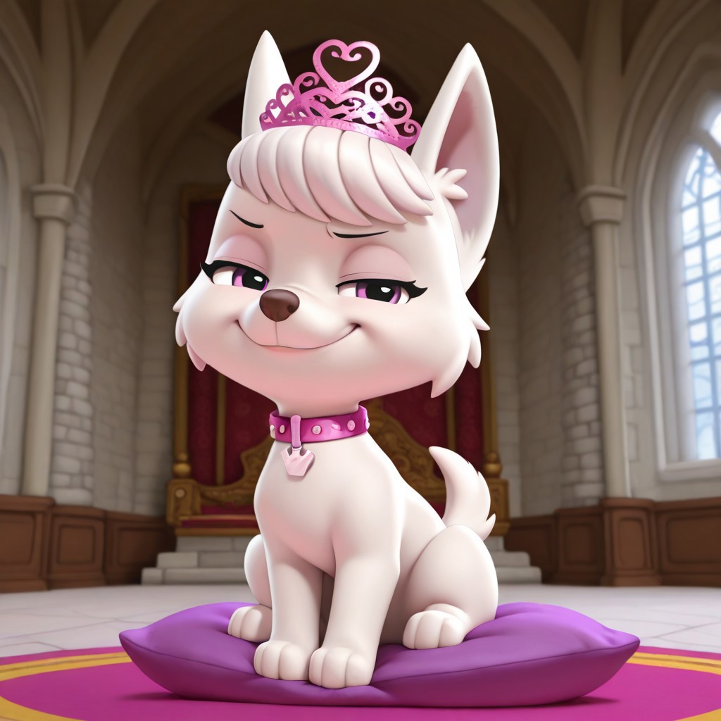 dog, dog girl, West Highland White Terrier, white fur, bangs, pointed dog ears, dog tail, short tail, pink eyes, pink collar, crown shaped dog tag, pink tiara,