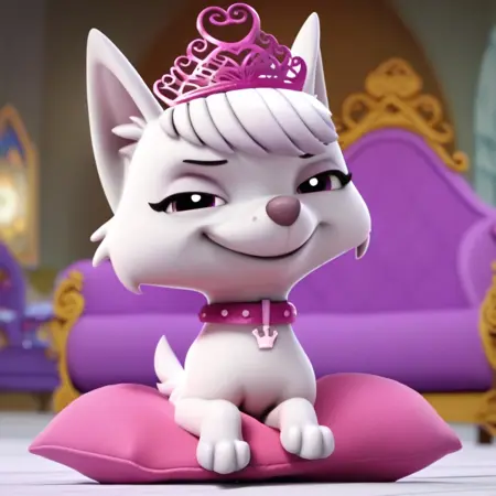 West Highland White Terrier, dog, dog girl, white fur, pointed ears, short tail, pink eyes, small body, pink collar, crown shaped tag,