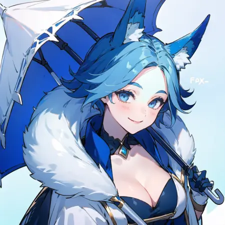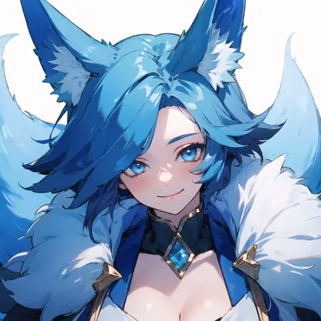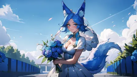 示例提示:1girl, medium hair, blue hair, blue eyes, large breasts, white dress, cleavage, animal ears, fox ears, fox tail