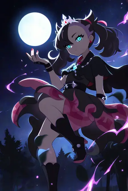 green_eyes, black_hair, tiara, dress, black_dress, fingerless_gloves, belt, earrings, ring, red_nails