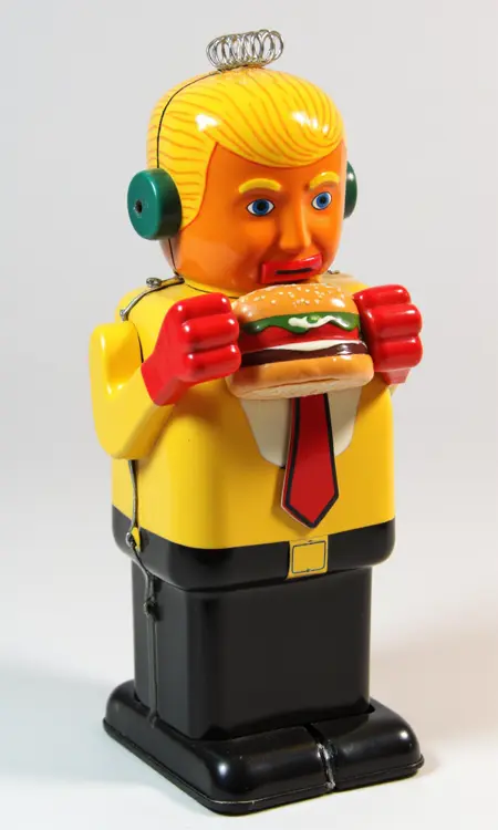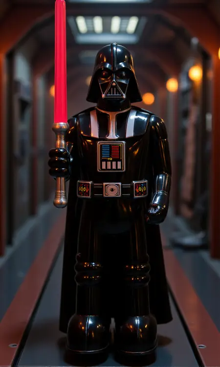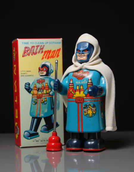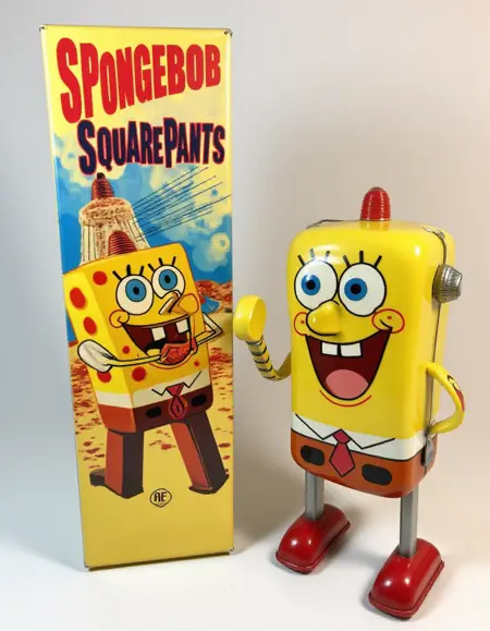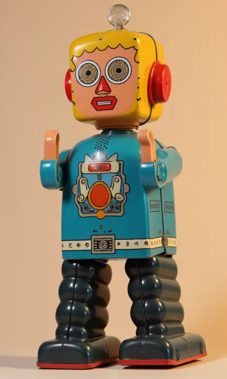 Prompt example (simple):vintage toy packaging with a tin toy robot standing next to it. The name reads "EXAMPLE ROBOT" in a bold font, with a small text above that say "mechanical wind-up"