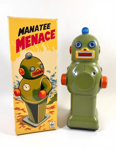 替代触发词:• 包装盒:vintage toy packaging • 玩具:vintage tin toy robot