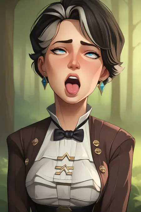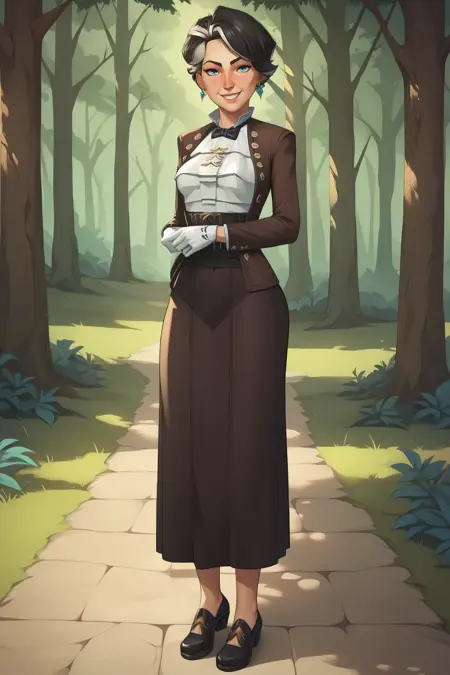➜ CassandraKirammanAPXL, blue eyes, black hair, grey hair, multicolored hair, short hair, earrings, medium breasts, black bowtie, brown jacket, open jacket, long sleeves, white shirt, ascot, white gloves, brown skirt, long skirt, black shoes