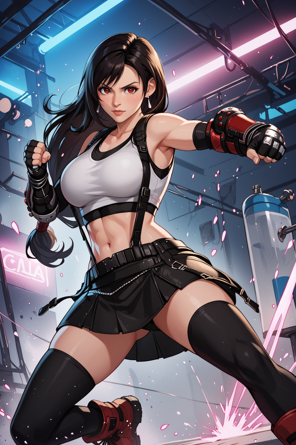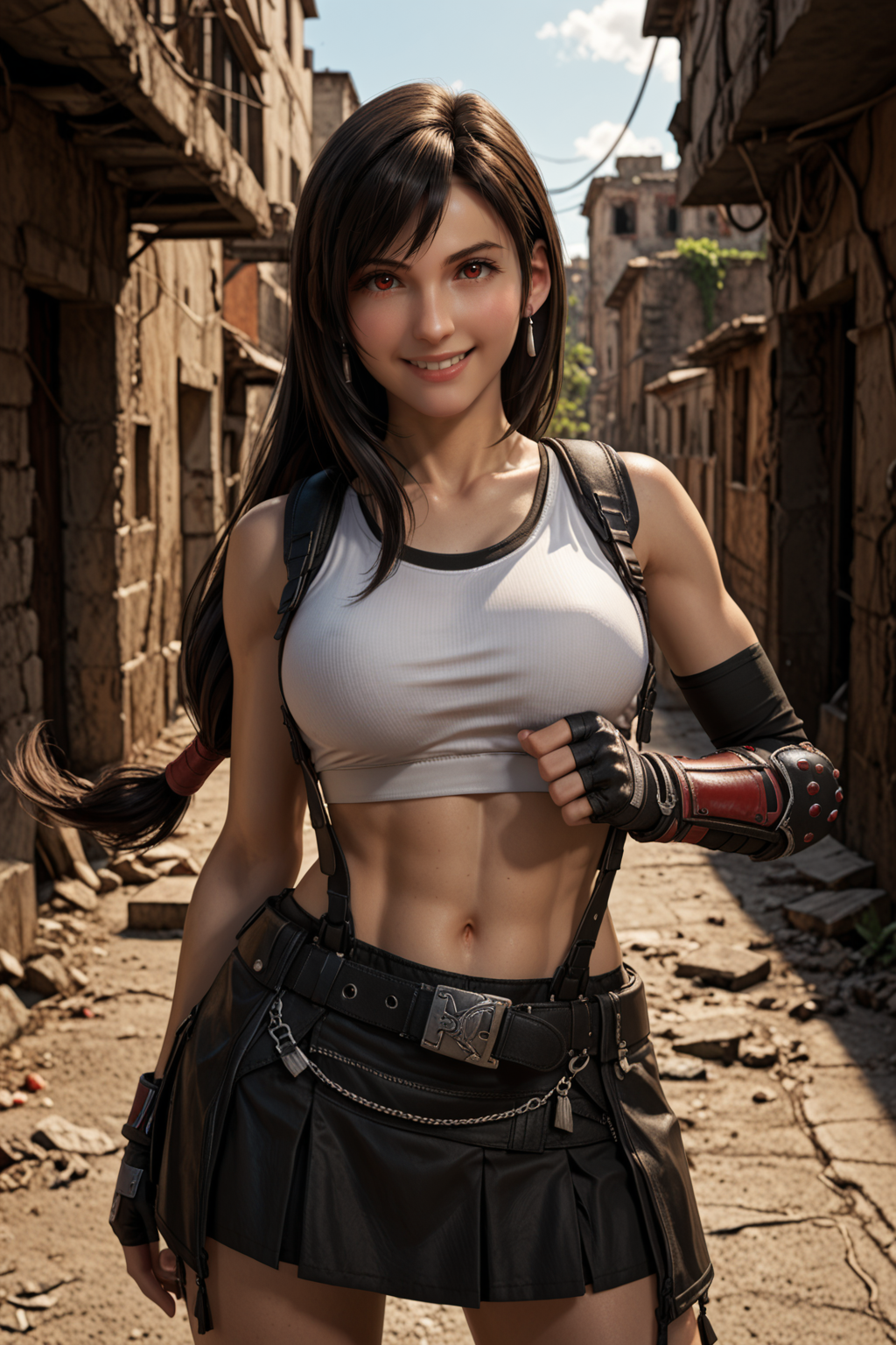 リアルトリガー:tfalckhrt, FF7Alt, 長髪, 直毛, 突き出た前髪, 赤い目, ペンダントイヤリング, 胸元露出, ベスト, タンクトップ, サスペンダー, 片肘グローブ, シャツハイズ, 靴, 中腹露出, フィンガーレスグローブ, 破れた服, サスペンダースカート, 破れたシャツハイズ