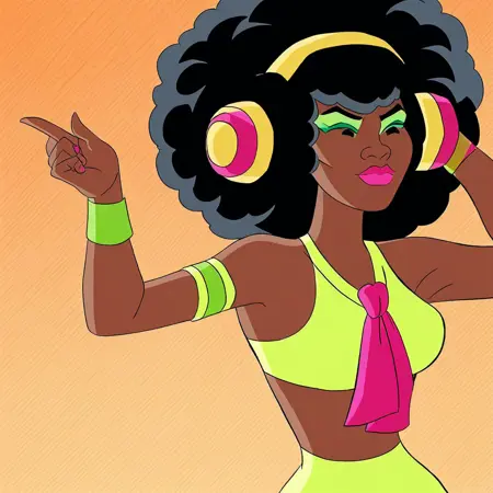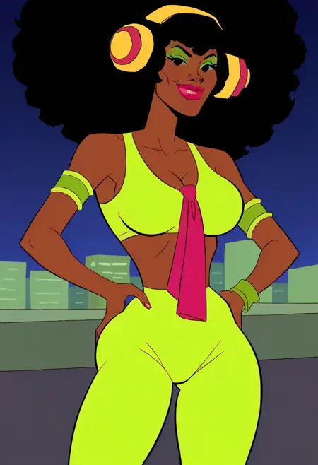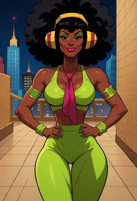1girl, solo, Angel_Dynamite, dark skin, ebony, ebony female, dark-skinned female, big hair, black hair, afro, yellow headphones, wearing headphones, hot pink lips, green eyeshadow, hot pink tie, green tank top, green tights, midriff, bell bottoms pants, armlet, wristband, sleeveless, bare shoulders,